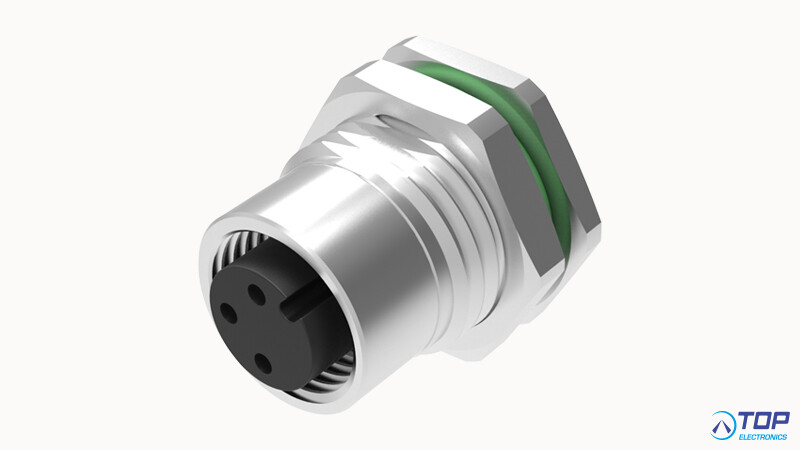 The Sensor/Actuator Female Socket, M12, B-coded, is designed for rear panel installation with a PG9 thread mount and features a soldering cup for secure and reliable connections in industrial environments.