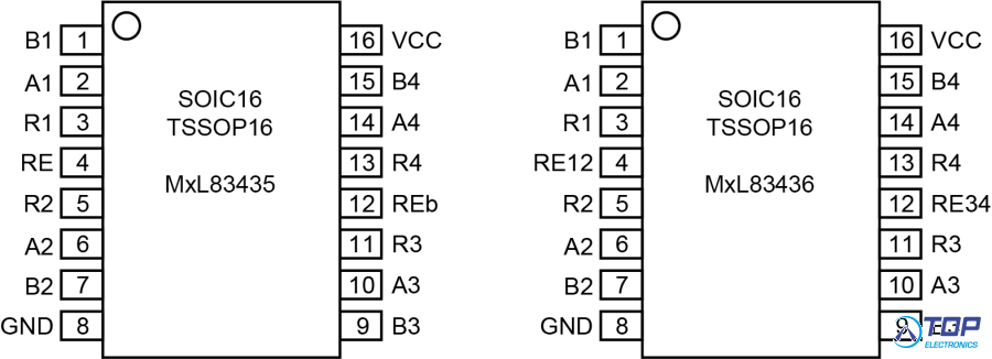 The MxL83435 device offers global enable pins, which allow all four channels to be enabled or disabled simultaneously. The MxL83436 device provide paired enable pins, allowing for the flexibility to control two channels at a time. Industry standard footprint and pinout ensure seamless compatibility for existing designs.