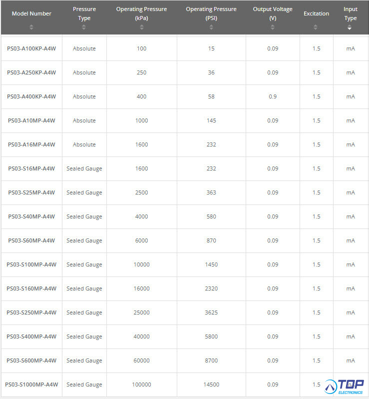 PS03 Series - 19 mm, 1.5 mA or 10 V Excitation, 4 Wires, Analog Output, Pressure Sensor